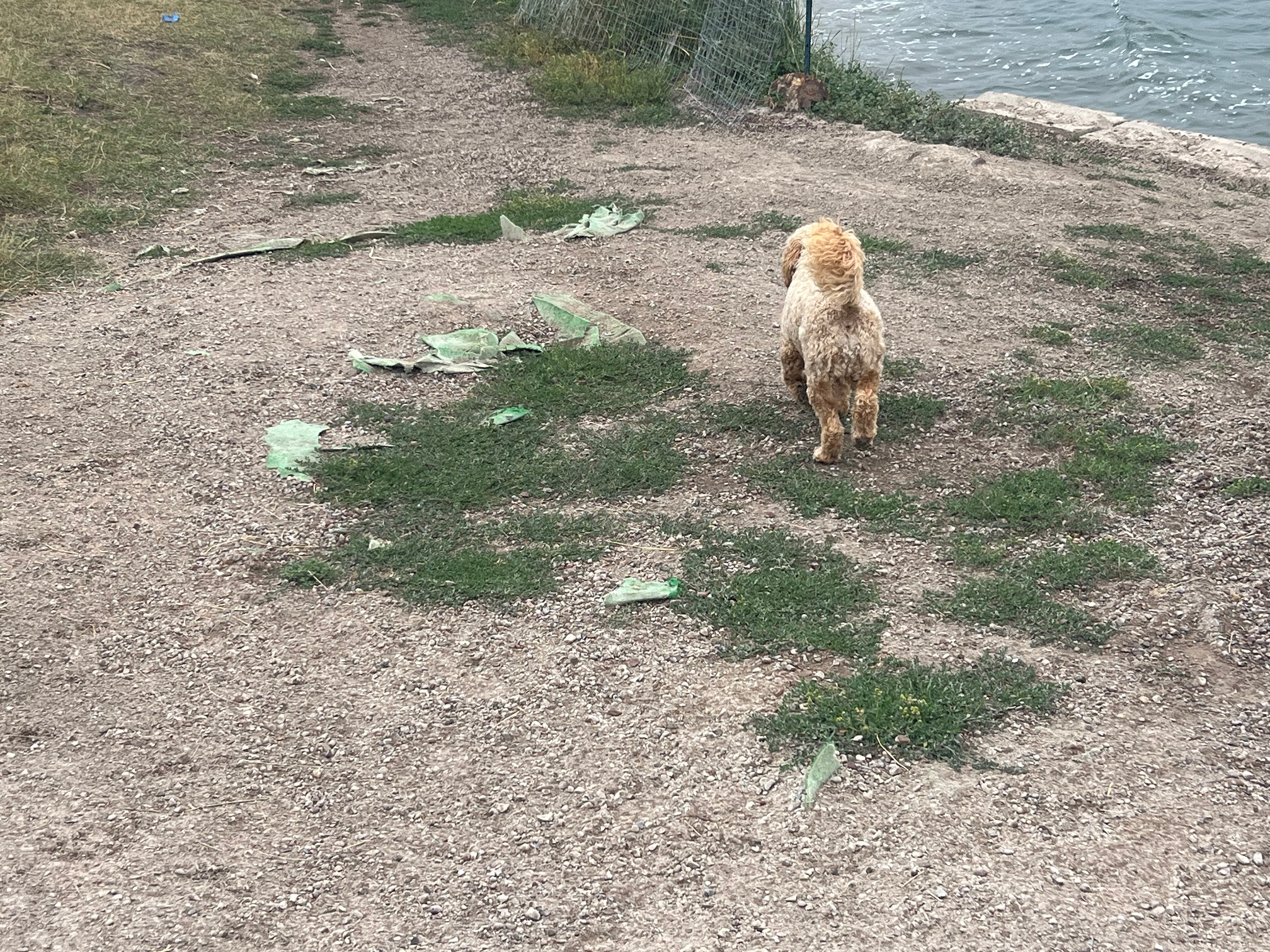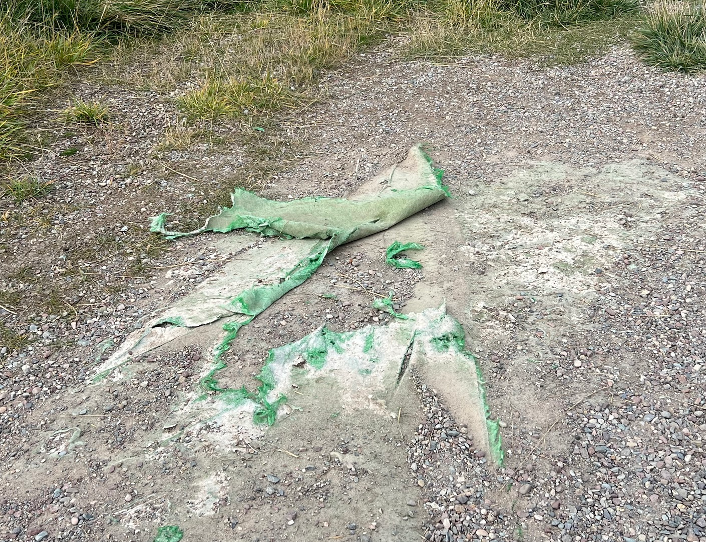 Replace the torn weed mat and replenish the gravel. This has not been done since the park’s beginning in 2007. It’s just a mess now and presents tripping hazzards. In addition, new weed mat will help mitigate the travel of glass to the surface.
